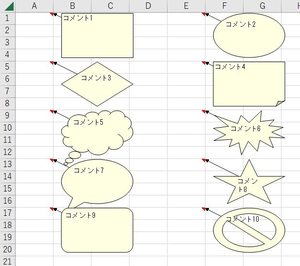AutoShapeTypeプロパティに設定できる種類は130種類以上ありますが、サンプルコードでは比較的よく使われそうな10種類のコメントの形を記載しています。