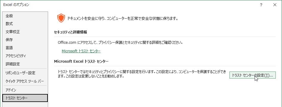 3.「Excelのオプション」画面が表示されるので、左下の「トラストセンター」→「トラストセンターの設定」を選択します。