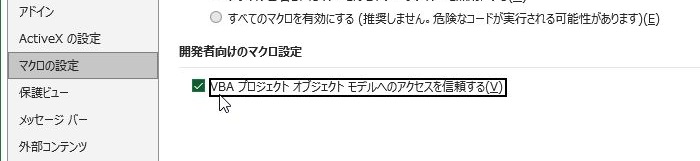 4.「トラストセンター」の画面が表示されるので、「マクロの設定」→「VBAプロジェクト オブジェクト モデルへのアクセスを信頼する」のチェックボックスにチェックを入れて「OK」を押下します。