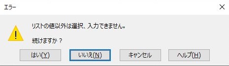 またリストボックスの値以外が入力などされた場合に警告メッセージ表示をさせたい場合はShowErrorプロパティに True を設定し、表示させたい警告のタイトルとメッセージ内容はErrorTitleプロパティ、ErrorMessageプロパティに設定します。