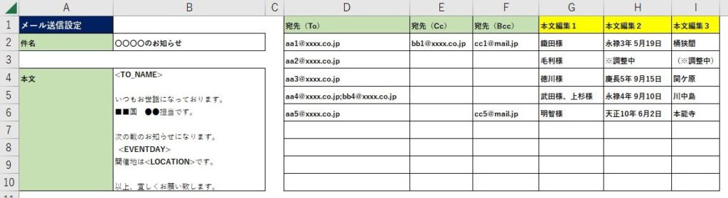 D列に送信先アドレス、E列とF列はCCとBCCの送信先を指定します。(複数ある場合は ; で区切る)