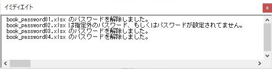 処理中に指定外のパスワード、もしくはパスワードが設定されていないブックがあった場合は、そのファイルは無視して処理を継続させています。